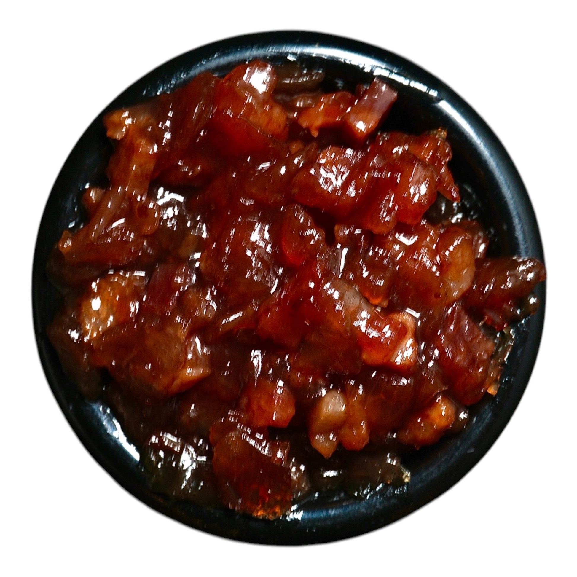 Nuestra mermelada de bacon, dale un toque diferente y único a tus creaciones con un sabor dulce y salado que hará que tu paladar explote de sabor, todos tipo de creaciones, hamburguesas, entrantes, sándwiches, etc. Recomendable trabajar en baño María o calentar antes de consumir.