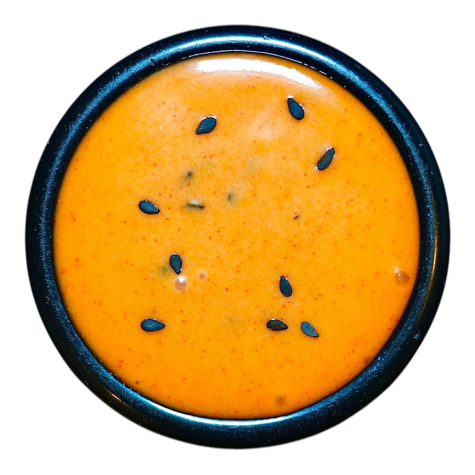 Nuestra interpretación de una de las salsas más icónicas en España, el Ali oli, con nuestro toque especial harán las delicias de cualquier entrante, no vas a parar de untar!!, porque como te pongas a untar patatas vas a tener que tener un carro a mano, especiada con comino y ajo entre otros, disfrute garantizado.